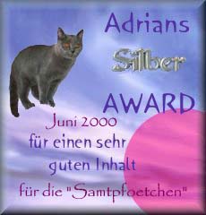 4. Juni 2000 "Ich habe nach längerem hin und her (wobei ich bewußt deine immer so lieben Tips außer Acht ließ - man muß ja schließlich objektiv bleiben *Schnurr*) und meiner Erinnerung an meinen allerersten Ausflug auf deine Seiten vor etlichen Wochen, mich zu folgendem Entschluß durchgerungen: Ihr verdient den wertvollen "Adrian Silber-Award"! Eure Startseite ist sehr nett gemacht. Der erste Eindruck ist für den Besucher schon mal sehr gut. Gut gefallen hat mir die Idee mit der Frames-Katze als Navigationshilfe, das Design ist schlicht aber geschmacklich sehr gut abgestimmt. Die farblichen Hyperlinks sind sehr gut. Der Inhalt ist schön übersichtlich und gut lesbar gestaltet. Die Videos und die Fotos mit den Sprechblasen sind eine super Idee! Deine Sammlung an Katzen-Gifs ist beachtlich. Trotzdem sind die Ladezeiten sehr gut - Gratulation." |