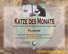 18. Oktober 2000 "wir können Ihnen heute mitteilen, daß es Ihre Katze "Florian" geschafft hat - sie darf sich als KATZE DES MONATS (August/September/Oktober) bezeichnen. Ihr Liebling gewann mit 25,9% der abgegebenen und gewerteten Stimmen. Angefügt an diese Mail finden Sie Ihre persönliche Urkunde. Herzlichen Glückwunsch an die Katze..." |
