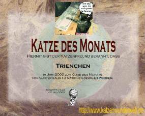 2. Juli 2000 "mit Freude kann ich Ihnen mitteilen, daß es Trienchen geschafft hat: Sie darf sich als "Katze des Monats" bezeichnen. Ihr Liebling gewann mit 37,6% der Stimmen. Als "Belohung" erhalten Sie die offizielle Katzenwunderwelt Urkunde, die Sie in Ihre Homepage einbauen oder einfach ausdrucken können." |