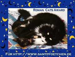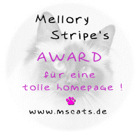 23.4.2000 "Die vielen Bilder gefallen mir sehr gut. Die Seite ist abwechslungsreich und übersichtlich aufgebaut. Auch an Überraschgungen fehlt es nicht. Bestimmt werden noch viele Katzenfans diese hübsch gemachte Seite besuchen. Da bin ich der Meinung, Deine Kätzchen haben sich eine spezielle Auszeichnung verdient." |