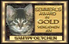 1. Mai 2000 "Ich habe Deine Seite heute angesehen. Sie ist einfach toll. Sehr schönes Design und absolut liebevoll gestaltet. Ein Muß für jeden Katzenfan! Leider hat die Videoseite nicht funktioniert ... vielleicht schaust dir das mal an! Sehr gut hast du die Navigation gelöst - schaut total super aus. Auch die Farbgestaltung ist harmonisch. Auch Deine umfangreiche Sammlung an GIFs kann sich sehen lassen - auch alles ordentlich unterteilt. Sehr gut! Man spürt förmlich wieviel Liebe du in die Seiten investiert hast. Es bleibt mir gar nix anderes über als dir den ersten SEMMERL-GOLD-Award zu überreichen. Herzlichen Glückwunsch!!!!!" |