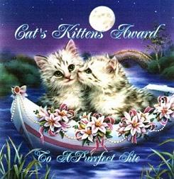 16. Januar 2001 "Hättet Ihr Euch nicht für unseren Award beworben, hättet Ihr ihn trotzdem bekommen, denn unser gestriger Besuch auf Euren Seiten hat uns so viel Spaß gemacht, daß wir einfach nicht anders können, als Euch unseren Award für die besonders gelungene Homepage zu verleihen. Eure Seite ist nicht nur für jeden Katzenfreund interessant, sondern hat auch noch ein Menge mehr zu bieten. Besonders gefallen haben uns natürlich die schönen Bilder, ganz besonders die der Baby´s und auch die Info´s zu den Katzenkindern. Kurzum Eure Homepage ist einfach spitze." |