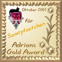 21. Oktober 2001"Die Entscheidung ist gefallen. Wir verleihen euch hiermit feierlich den zweiten vergebenen (neuen): ADRIAN GOLD AWARD Erster Eindruck - sehr gut. Euer neues Design ist toll geworden. Was mir immer schon gut gefallen hat: Die Pfote - die euer Markenzeichen ist. Über den Inhalt gibts wenig zu sagen - es gibt hier nichts, was nicht mit Katzen zu tun hat. Ob es nun die Postkarten, die Spiele oder die Bilder sind. Die Farbabstimmung ist perfekt gelungen, sehr schöne Bilderrahmen habt ihr den Fotos verpaßt. Selbst das Gästebuch paßt zum Design. Tolle Ladezeiten und gute Lesbarkeit runden das Bild ab. Abschaltbare Musik ist ohnehin ein Muß. Bravo! Die Navigation ist sehr gut gelungen. Gut gefällt uns nach wie vor die Katze im Eck und die Links, die sich farblich ändern und zeigen, was man schon gesehen hat und was nicht. Nette Idee - das Kontextmenü der rechten Maus und der animierte Cursor. Ein wenig Spielerei darf ruhig sein. Bis auf einen kleinen Fehler im XXO-Spiel gibt es sonst nichts zu meckern. Vorbildliche Awardpräsentation. Wir gratulieren herzlichst! Man merkt, dass Dosi Netty genau und mit viel Liebe an ihrer Homepage arbeitet. *Schmusebussi* von Adrian und Silvia" |