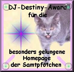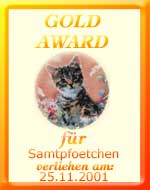 ![]() erhalten im Jahr * 2000 * * 2001 * * 2002-2005 * Und diese schönen Awards haben wir im Jahr 2001 für unsere Arbeit an Samtpfoetchen.de verliehen bekommen. Dankemiau und ein lautes Schnurren von uns Miezekatzen! |