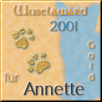 22. November 2001deine schöne Katzenhomepage kannte ich ja bereits durch meine Awardbewerbung bei euch und diversen Besuchen zwischendurch, aber ich habe mich wirklich sehr darüber gefreut, dass du dich auch um unseren Award beworben hast. Deiner Einladung bin ich natürlich gerne nachgekommen und habe jeden meiner sechs Besuche im Bewertungszeitraum sehr genossen. Das neue Design finde ich persönlich ebenso toll wie bereits das Alte - die Pfotenabdrücke sind ja inzwischen das Markenzeichen von Samtpfoetchen.de und das Gesamtbild der Website ist einfach toll, mehr kann ich dazu eigentlich gar nicht sagen. Die Farben harmonieren alle miteinander und das Design wurde mit sehr viel Liebe und Kreativität perfekt in Szene gesetzt. Die Ladezeiten befinden sich mit und ohne ISDN in einem gewohnten Rahmen, auch wenn ich mal etwas länger warten musste, es hat sich auf jeden Fall gelohnt. Über die übersichtliche und gut nachvollziehbare Navigationsführung lässt sich natürlich auch nicht meckern. Die Katze in der linken Ecke zeigte mir farblich an welche Rubrik ich bereits durchwuselt hatte (Idee und Umsetzung verdienen ein großes Lob von mir) und das Kontextmenü mit der rechten Maustaste ist ebenfalls eine tolle Idee gewesen. Alle Links waren übrigens funktional und ich bin in keiner unerwünschten Sackgasse gelandet. Auf Samtpfoetchen.de findet man eigentlich alles rund um die Thematik Katzen, seien es interessante Berichte über Trächtigkeit und die anschließenden Katzenkinder, Tipps zur Ernährung, Katzenbücher und Nachschlagewerke, Katzenkalender und etc. - jede einzelne Rubrik habe ich mit großem Interesse durchgelesen bzw. -gesehen und begeistert haben mich auch die schönen Fotos deiner Katzen, die die einzelnen Seiten passend unterstrichen haben. Auch die Vorstellung deiner Stubentiger Trienchen, Jerry & Florian habe ich mir gerne angesehen, schließlich durfte ich einiges über die drei erfahren und ich finde es immer wieder toll, wenn ein Dosenöffner seine Tiere dem Besucher mit Bildern vorstellt. Natürlich wollte ich mir auch die diversen Videos angucken, aber irgendwie hatte ich heute Pech, denn keines hatte funktioniert. Aber ich sehe sie mir dann eben auf einem meiner nächsten Besuche an. Einen kleinen Artikel hatte ich mir übrigens sehr zu Herzen genommen - du hattest ihn bezüglich der Rasse- und Hauskatze geschrieben und in diesem Fall vertrete ich die selbe Meinung wie du und ich möchte es mal loben, dass du es nicht nur gedacht sondern auch niedergeschrieben hast und ich hoffe, dass einige Katzenhalter und -züchter auch dadurch etwas ins Grübeln kommen und etwas vorsichtiger mit Behauptungen werden. Auch ich kann aus meiner persönlichen Erfahrung sprechen, dass eine "gewöhnliche Hauskatze" wie unsere Dharma Charaktereigenschaften wie unser kleiner Norwegischer Waldkatzenkater Saron hat. Uns war es im Grunde genommen egal ob Haus- oder Rassekatze, da mich aber die Norweger schon immer fasziniert haben, holten wir uns Saron nach dem Tod unserer Kyra ins Haus. Es kommt alleine, wie du schon gesagt hast, auf den sozialen Kontakt an und dieser prägt den Charakter einer jeden Katze. Dein Awardbereich entspricht übrigens meinen Vorstellungen in jeder Hinsicht, bei dir werden die Auszeichnungen samt Laudatio in einem würdigen Rahmen veröffentlicht. Zu so viel Lob hatte mich aber doch eine Kleinigkeit gestört: wenn ich zurück auf das Hauptmenü bin und eine andere Rubrik angeklickt habe erschien mir immer wieder aufs Neue das Fenster "Aufwiedermiau" - nur eine kleine konstruktive Kritik am Rande, die in meinen Augen als eine Art Verbesserungsvorschlag angesehen werden sollte. Zum Abschluss möchte ich dir nun noch herzlichst unseren Wuselaward in Gold überreichen, den du meiner Meinung nach einfach für deine schöne Katzenhomepage verdient hast. Es war mir eine Freude Samtpfoetchen.de bewerten zu dürfen und ich hoffe, dass du unsere Auszeichnung annimmst. Ein kätzisches Miau von Sherin & Wuselbande |