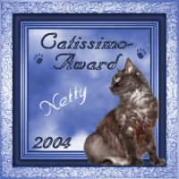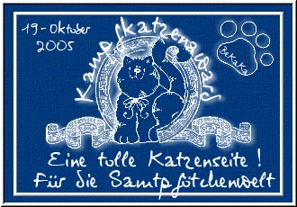 16. Dezember 2004Ich kenne deine Seite schon eine ganze Weile und da dachte ich mir, ich verleihe dir das AktionCatz Award. Diese Urkunde bekommen nur ganz super, gute Katze- und Petz Seiten. Alles auf deiner page ist super.