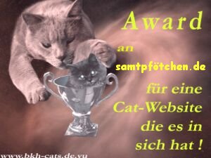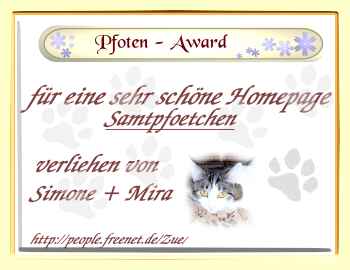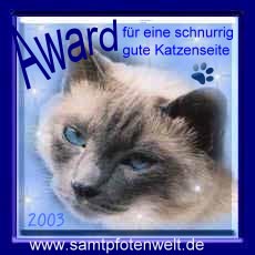 nachdem wir uns in Euer Gästebuch eingetragen hatten, sind wir noch lange über Eure Seiten gepfotelt und waren mehr als begeistert! Die Homepage ist soooo liebevoll gestaltet und die Fotos so schön und witzig bearbeitet, daß wir uns hier sehr wohlgefühlt haben und Ihr unseren ersten Award (wir sind erst seit Februar 2003 online) bekommt!